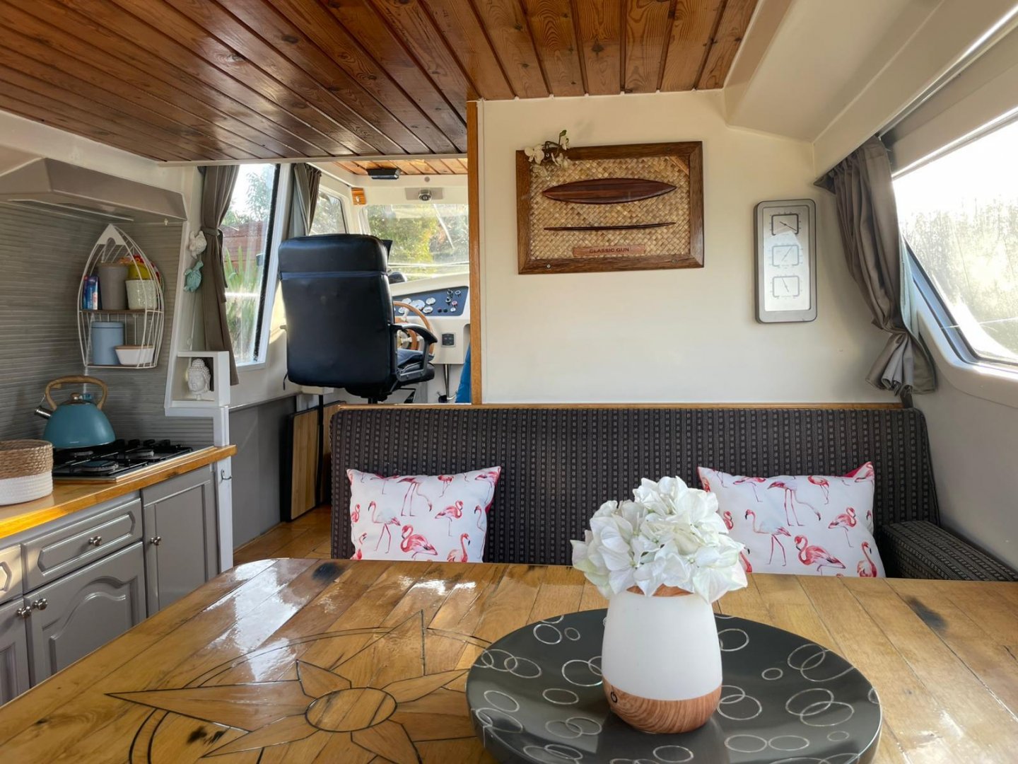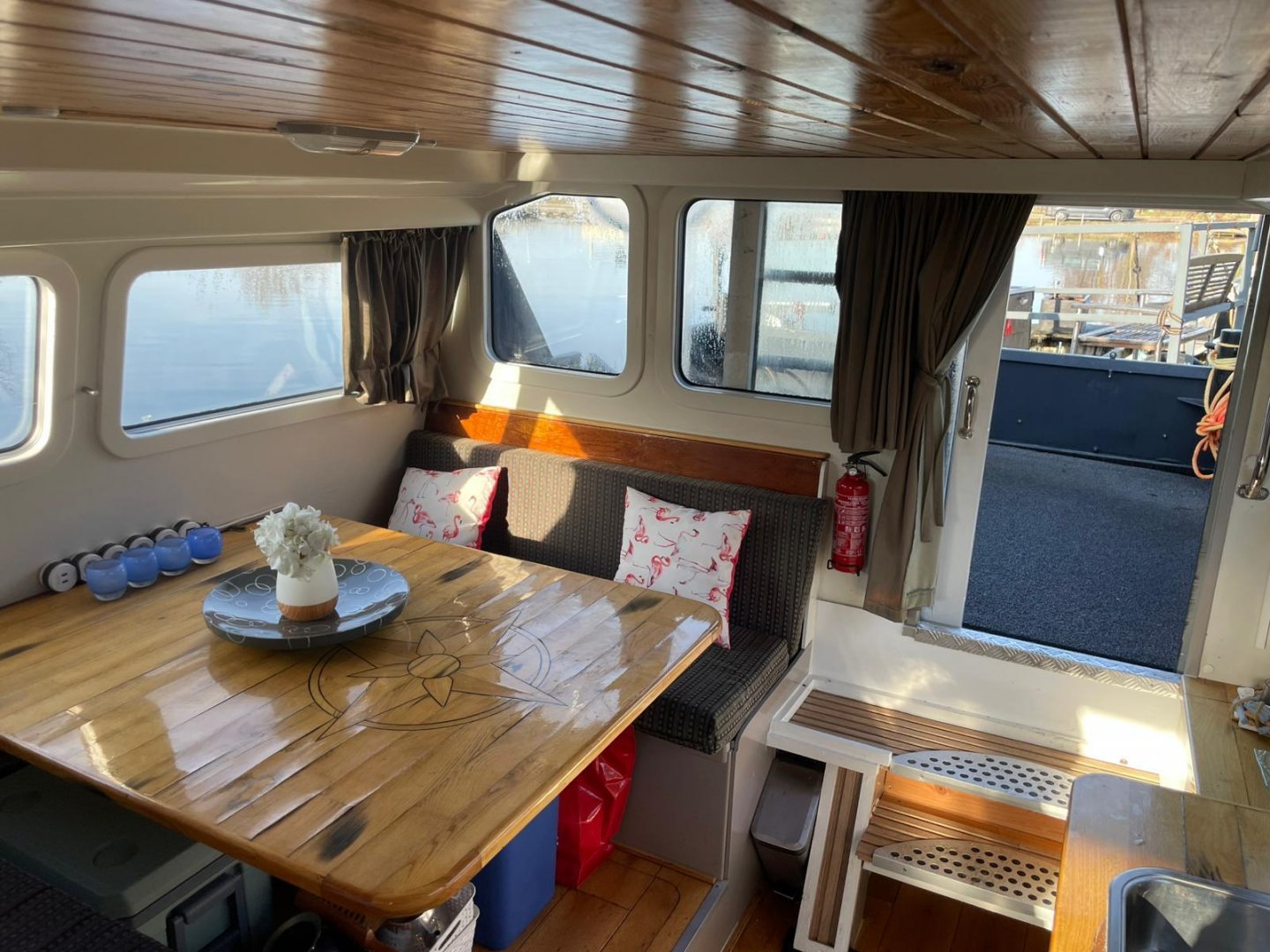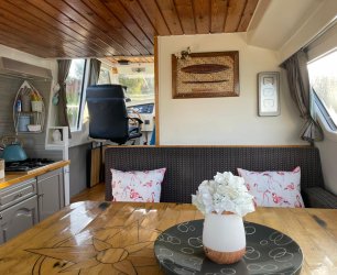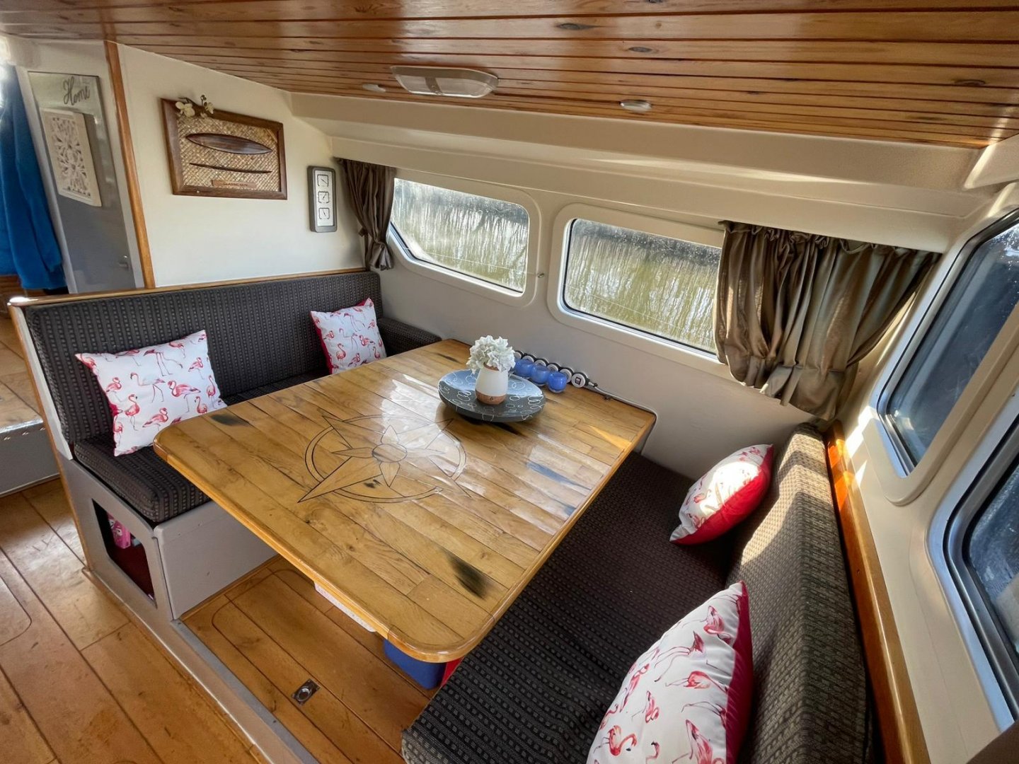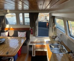 De combinatie van salon en stuurhut zorgt voor één centrale leefruimte met veel lichtinval en zicht naar buiten. De warme afwerking met houtaccenten draagt bij aan een prettige, huiselijke sfeer. Dit maakt het schip geschikt voor zowel korte verblijven als langere periodes aan boord.