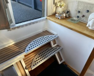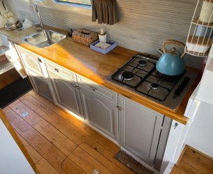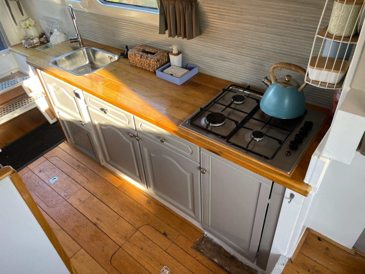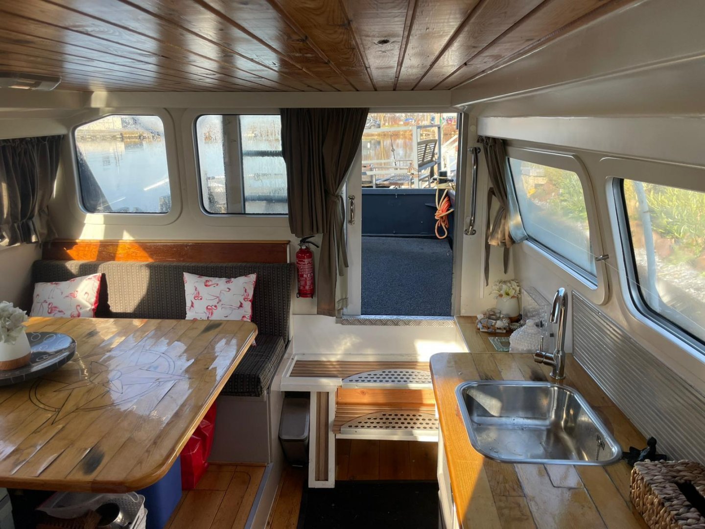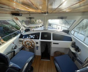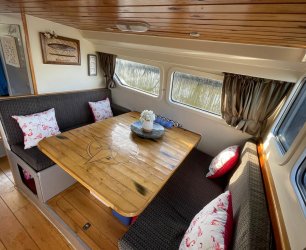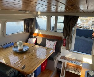 De combinatie van salon en stuurhut zorgt voor één centrale leefruimte met veel lichtinval en zicht naar buiten. De warme afwerking met houtaccenten draagt bij aan een prettige, huiselijke sfeer. Dit maakt het schip geschikt voor zowel korte verblijven als langere periodes aan boord.