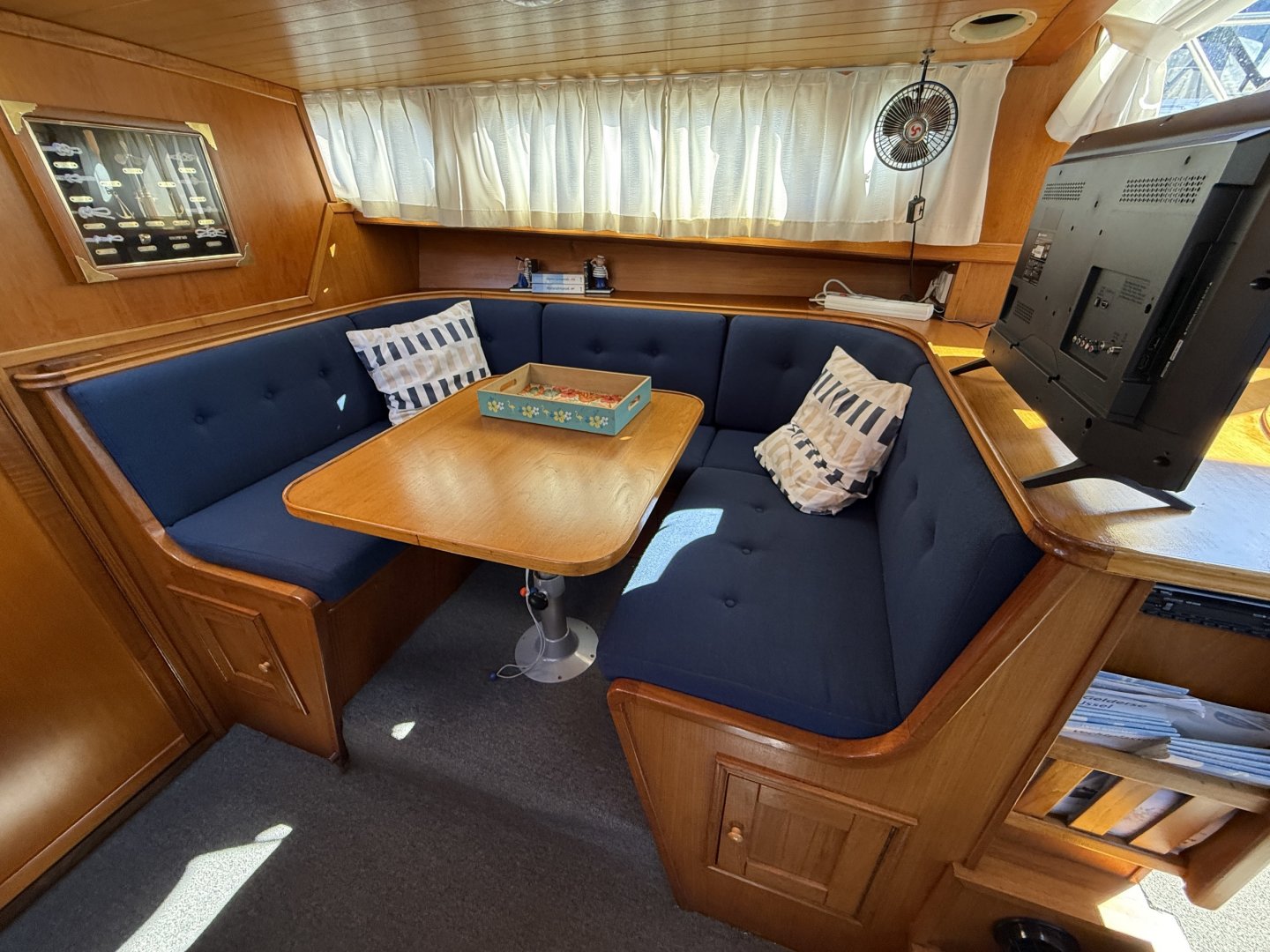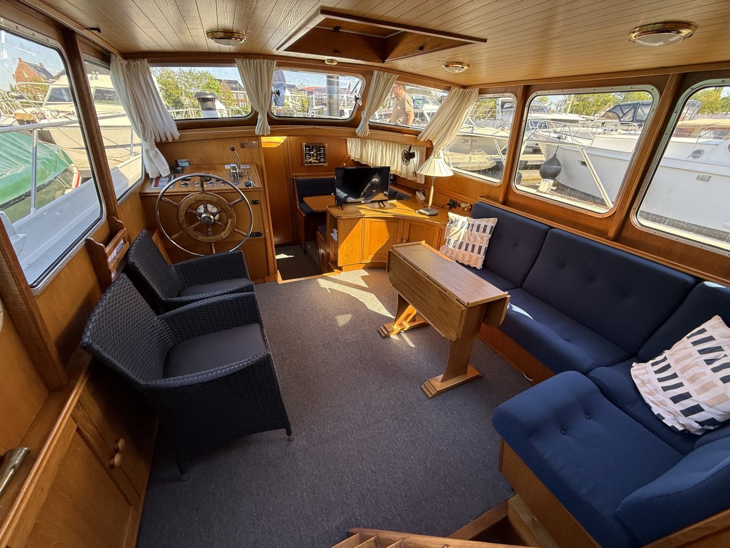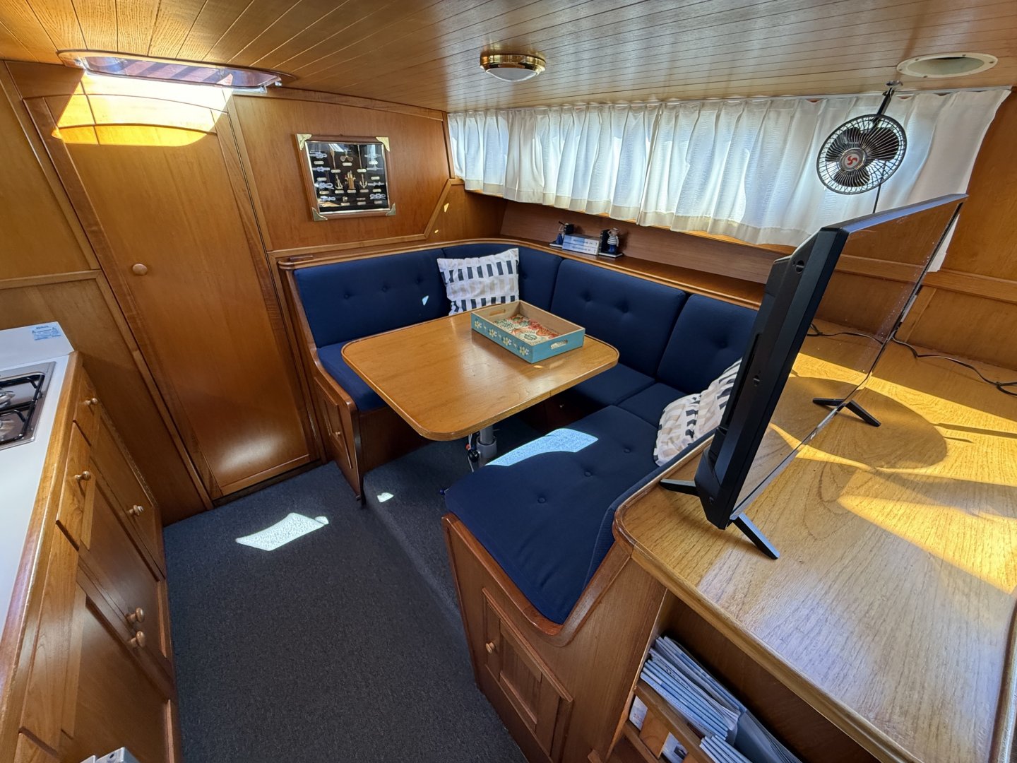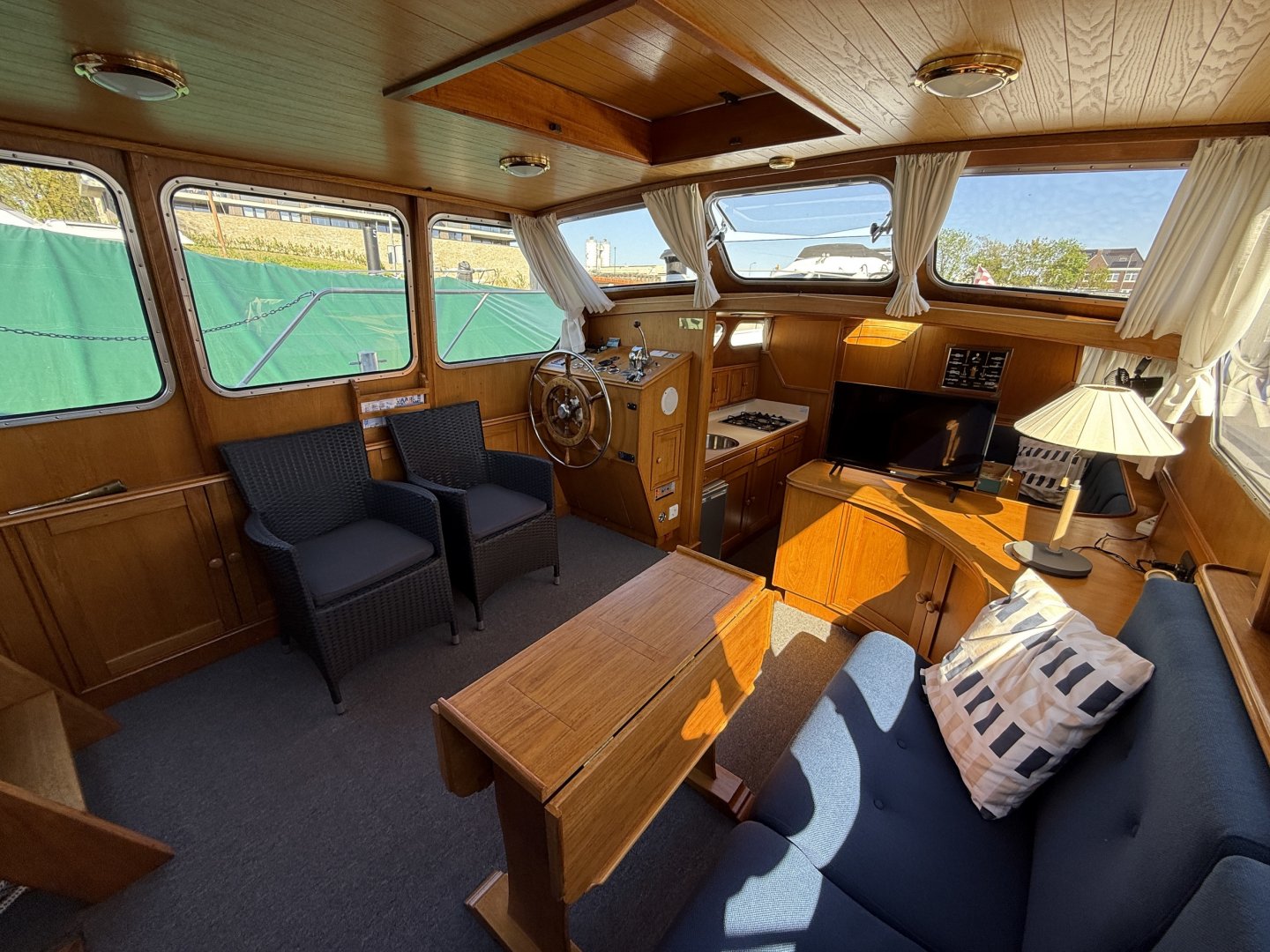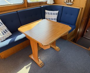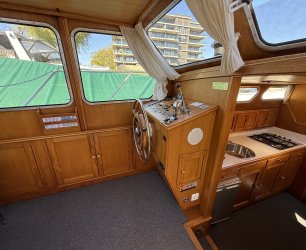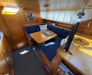 In de salon bevindt zich een L vormige bank, twee losse zitstoelen en een tweede stuurstand. Aansluitend ligt de kombuis met een 4 pits RVS kooktoestel, spoelbak en een compressor koelkast van 80 liter uit 2021. Hier bevindt zich ook een ruime dinette die om te bouwen is tot een tweepersoonsbed.