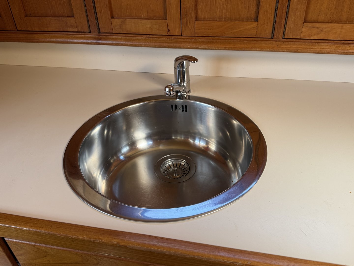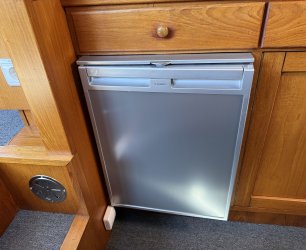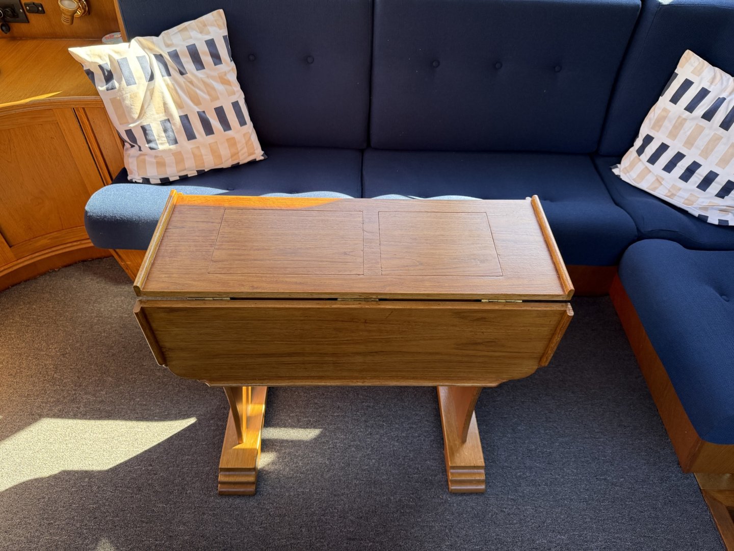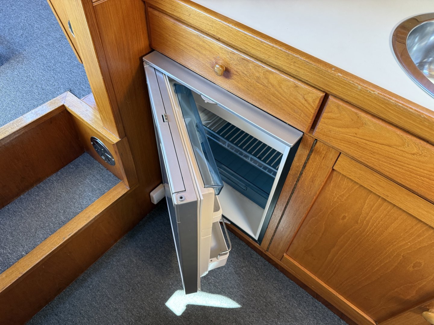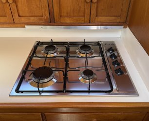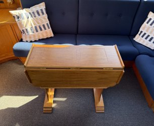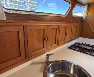 In de salon bevindt zich een L vormige bank, twee losse zitstoelen en een tweede stuurstand. Aansluitend ligt de kombuis met een 4 pits RVS kooktoestel, spoelbak en een compressor koelkast van 80 liter uit 2021. Hier bevindt zich ook een ruime dinette die om te bouwen is tot een tweepersoonsbed.